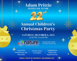I am thrilled to host our 22nd Annual Children’s Christmas Party event! This year’s event will be held on Saturday, December 6th at 12:30pm at the Canada Museum of Nature.